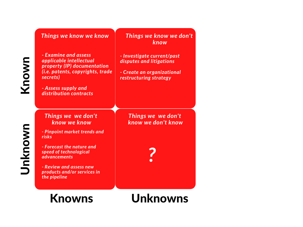 When carrying out due diligence for an investment, you will analyse some key domains for the business you are looking to invest in such as Legal/IP, Finance, HR, Market, Competition, PPE, Customer, Product/Service.